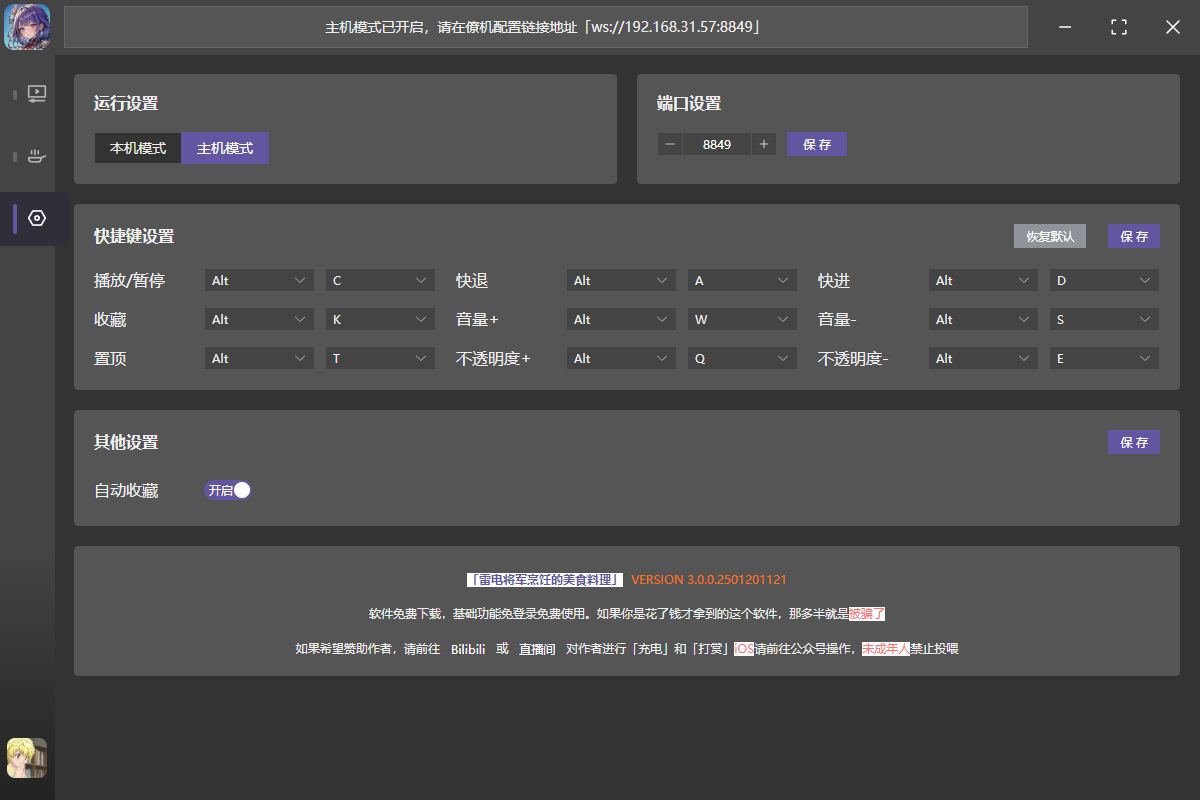 - 主机模式:适用于多设备但主体电脑仅有一个屏幕的用户。在局域网内,主机端安装「雷电将军」,僚机端安装「八重神子」。主机端在「运行设置」中切换为「主机模式」,若有需要可在「端口设置」切换端口(默认为 8848,修改后点击保存生效)。切换成功后,软件顶部会显示主机链接地址,此时主机处于僚机未连接状态。主机端显示链接地址后,僚机端在链接地址处输入该地址并点击连接按钮。若按钮显示为「断开连接」,则表示僚机端与主机端已成功建立联系。主机端在僚机连接成功后,顶部会显示僚机的连接数量。